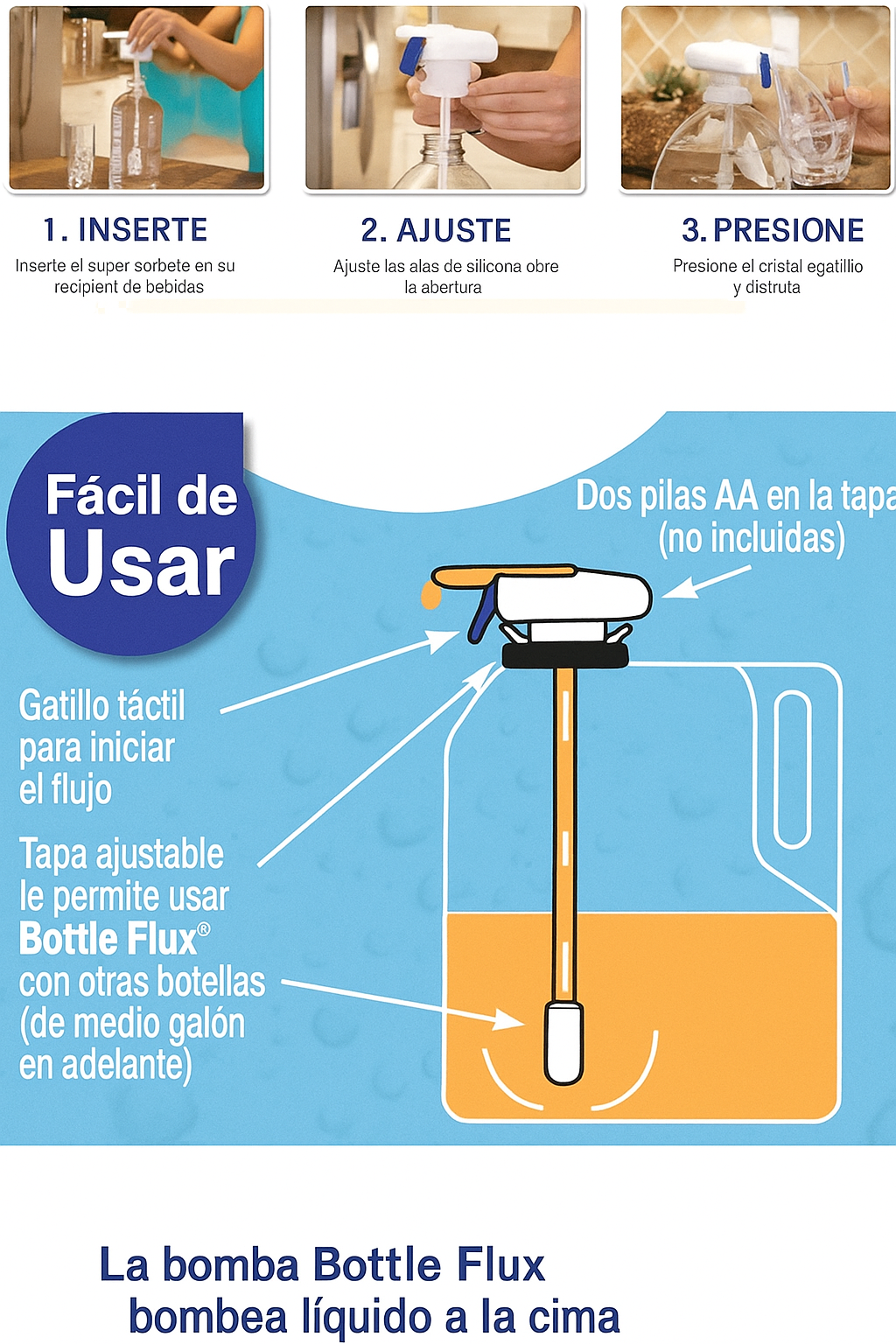 Compatibilidad: Botellas estándar y grandes (zumos, agua, leche, aceite, etc.)